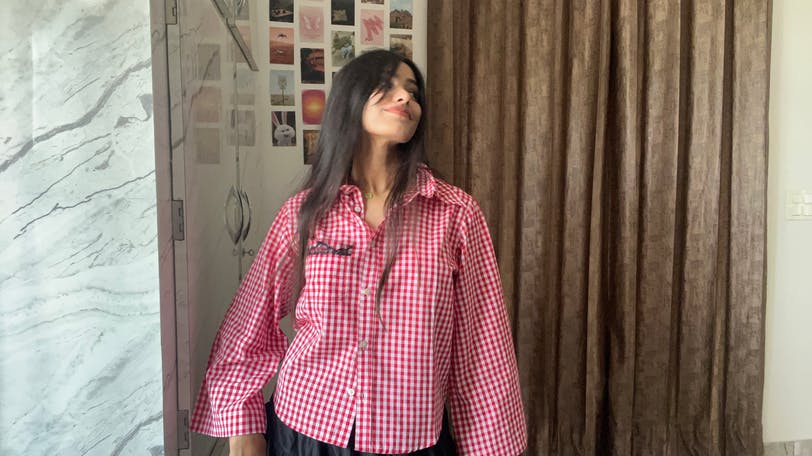 Regular fit gingham shirt with long Kimono sleeves and a lace patch on the pocket.